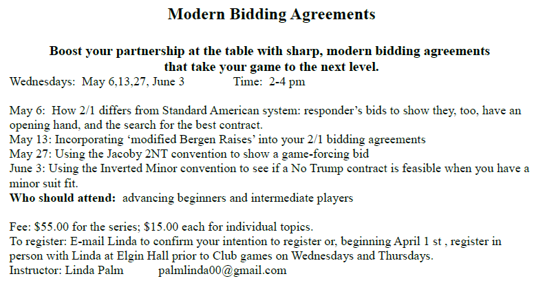 We will be starting a new game for players who have just completed our Bridge 101 and Bridge 102 courses. Other players with fewer than 20 masterpoints are welcome to join in. The game will be on Tuesdays at 9 am with the first game on April 7.