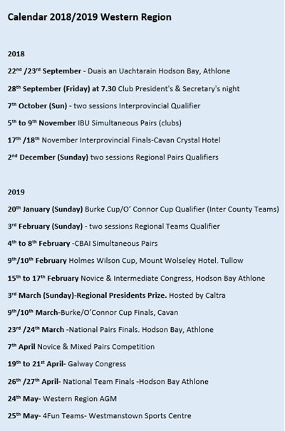 The Western Region organises regional events (Regional Pairs, Regional Mixed Pairs, Regional T/4) which facilitate qualification to the relevant National Events organised by the CBAI. See the schedule of regional events listed below.