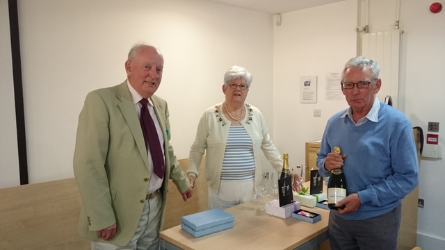 Presented by the President, Peggy Lowe, to the winners, Nick Lowe and Seamus O'Colmain, second Rick and Geraldine Crowe, third Aileen and Michael McMahon.