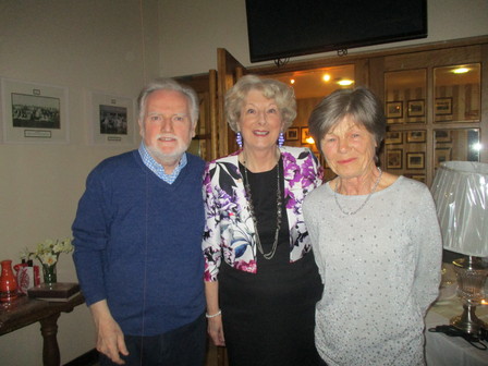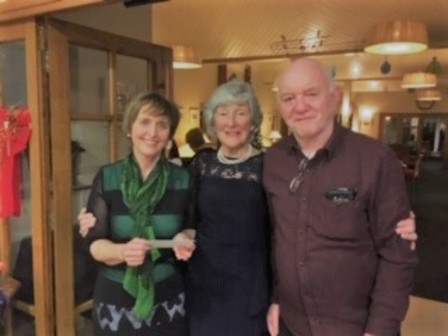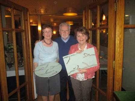 Our president Toni Leech presents the presidents prize to winners Mary McIlhenny and Adri Berney .