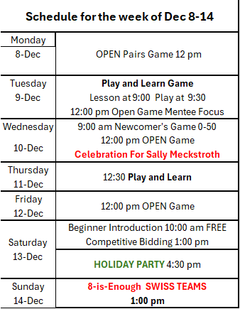 The holiday season is upon us, and what better way to celebrate than by gathering with friends and fellow club members for a festive evening of delicious food and an exciting bridge tournament? Mark your calendars for Friday, December 13th!