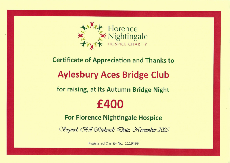 Since our club was set up in 2009, Aylesbury Aces has been committed to raising money for charity through our annual Charity Bridge teas and Children in Need Sim Pairs.