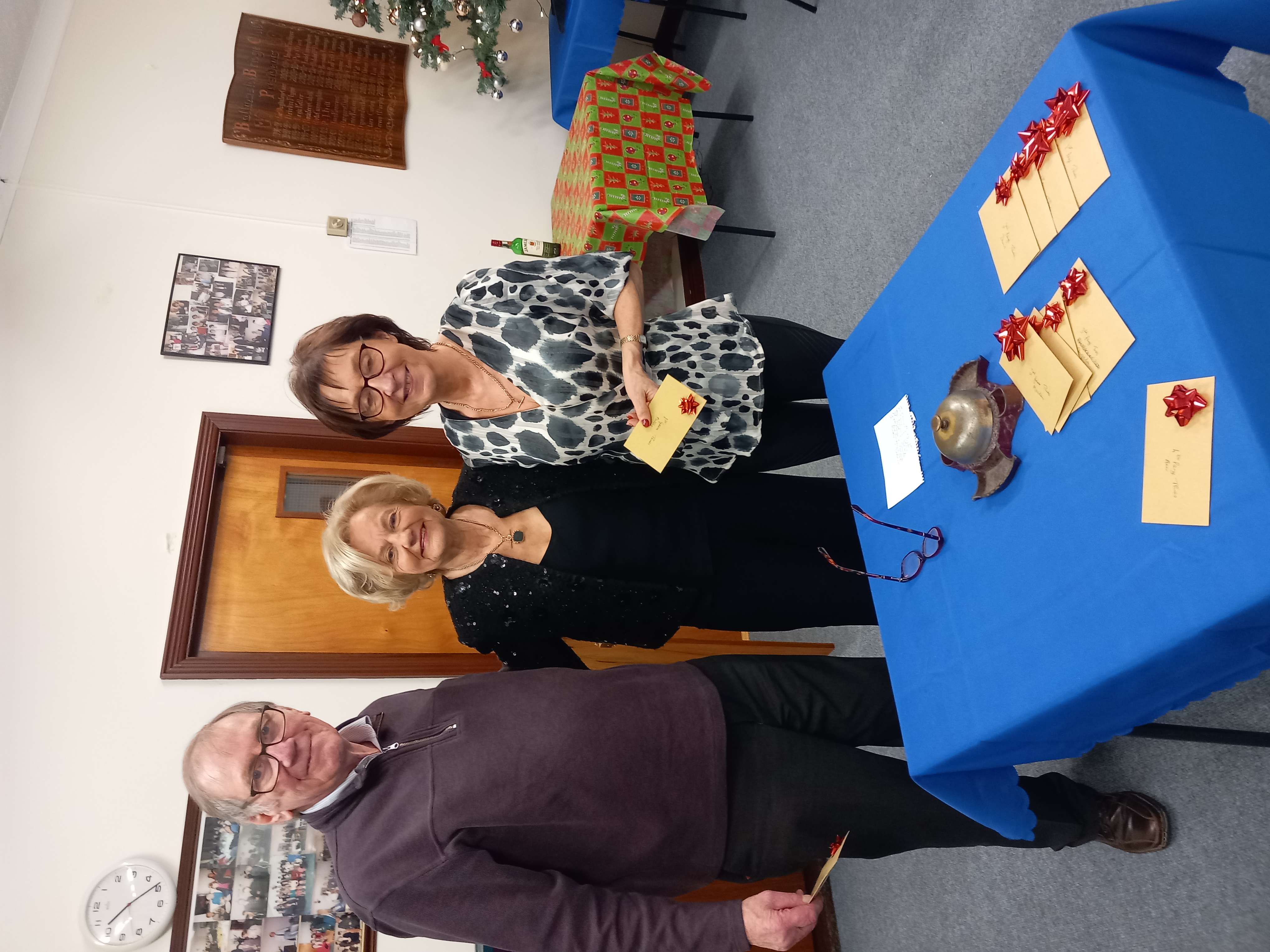 President Angela Lyons presenting the Christmas prize winners to Clive Robinson and Rosaleen Cahill
