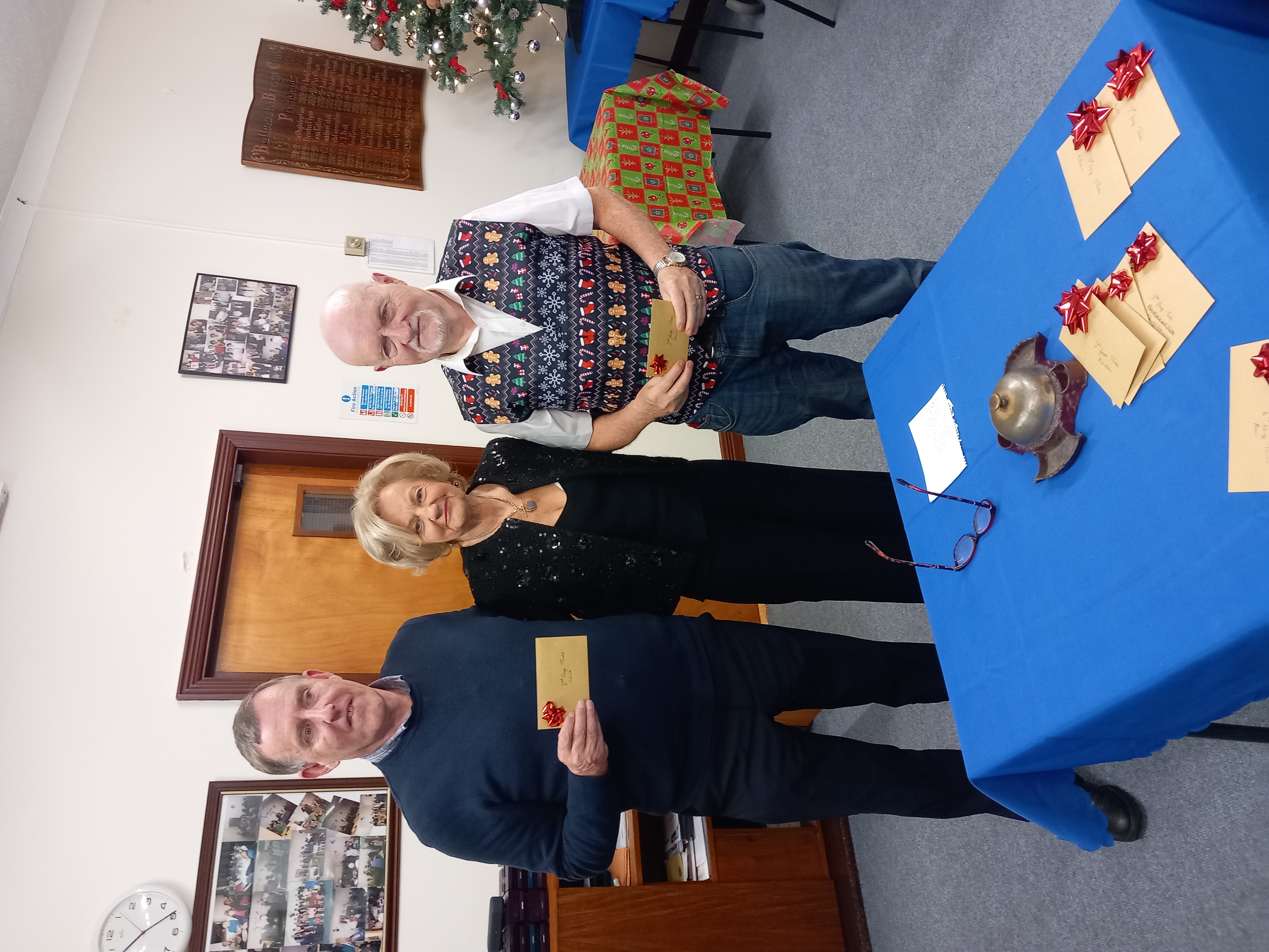 President Angela Lyons presenting the Christmas prize winners to Clive Robinson and Denis Lynch.