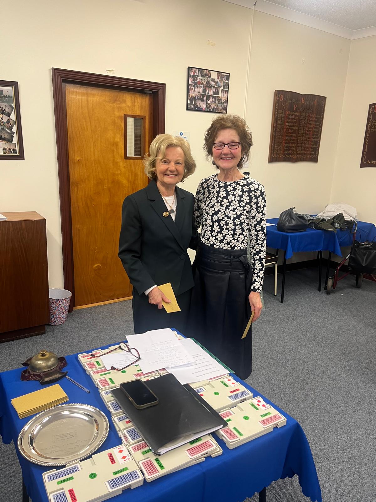 President Angels Lyons presenting the Christmas dinner prize winners to Jean Naughton and Eilish Goode