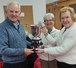 Anne O'Neill and Maureen Nott being presented with the Trophy by Ruth Lane