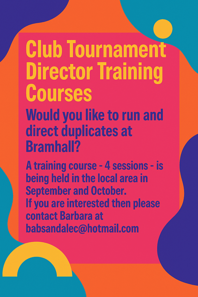 We will be holding our annual Simultaneous Pairs next week - to raise money for the BBC Children in Need: the same hands being played simultaneously in many bridge clubs throughout the UK. Our duplicates will be at Bramhall on Monday November 10th at 1.30pm, and Tuesday November 11th at 7.30pm.