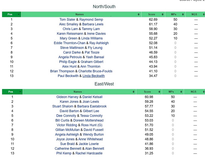 Congratulations to Julia Bannister, Jean Crowhurst, Pam Stone and Kathy Priestley who won the Wednesday night special event: Point-a-Board teams competition. The results are HERE