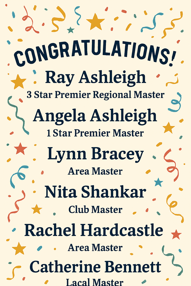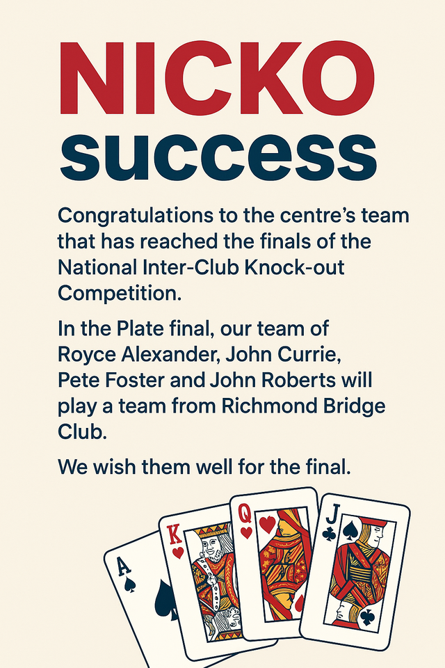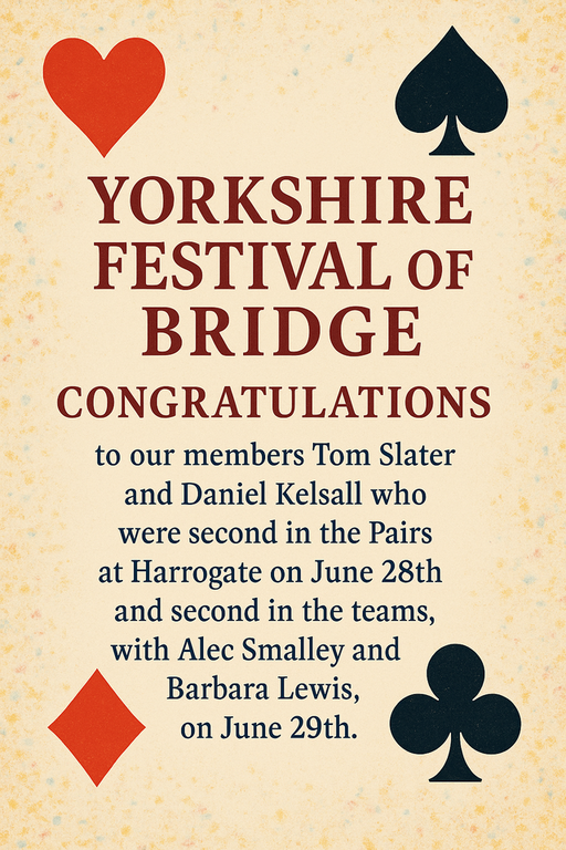 A major highlight has been the success of our teaching for beginners, with the 2nd cohort of newcomers soon to complete their 2-year course. Congratulations are due to the students for their enthusiasm and progress and to our dedicated group of teachers and mentors. We are in process of recruiting for a new cohort of students to start in January 2026: if you have family or friends who would like to learn bridge then they should contact Ric Swindell on ricathome50@hotmail.com or 0777 294 6643.