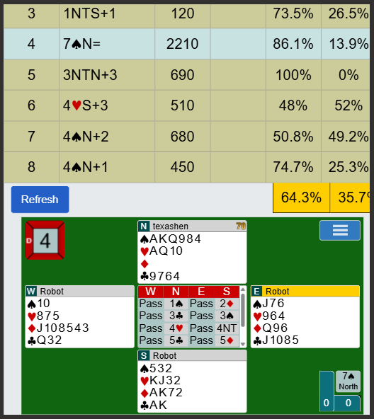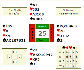 I could now draw trump in one round (keeping track of the shape of the heart suit, 7321), and pitch my little spade on the club king afterwards. Then, what do you do about diamonds? In my early days, I'd be likely to finesse for the diamond Queen through West, since "East has long spades". But, older and wiser, I'm also getting a count on East's hand: six spades, two hearts, only one club... where are his other cards? They must be four diamonds if he overcalled a six-card spade suit. If East has four diamonds, his partner has only two, and so it's 2-to-1 odds that East has the diamond Queen. So at the table, I led the diamond Jack from dummy, East plays low, I play low, and... West plays the Queen No -- West plays low! At this point, I face my hand, claiming my 12 tricks: Seven hearts, a spade, a club, and three diamonds (J, A, K).