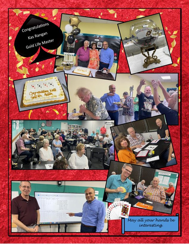 September symbolizes transition from summer to fall, harvest and abundance, new beginnings and the balance of day and night at the autumn equinox. Our club is much like the month of September; we are constantly beginning anew and hoping to achieve equilibrium with our finances! We have been blessed with abundant friendships and celebrations. And we have been blessed with benefactors who have bolstered our club! One in particular made a sizable donation that has lifted my spirits and faith that we can continue to grow to the point of sustainability. We have decided we should recognize the ones who have made contributions to the club with a special section of our website. After looking back, we realized donations have been happening all along and all are important. We will identify donors but not amounts. Any amount is appreciated! We also had a grass root campaign to recognize Marily Knatz and Kas Rangan for their contributions to building the Saturday game. Each will have a game named for them at the Houston Regional Tournament! These were paid for by donations from the players who love and admire them. The first Saturday of September we will be celebrating the life of Bill Daniel who left us for eternity a few months ago. His family thought it was fitting to have this at our club where he loved to play and mentor other players. There will be a game and lunch furnished, so please come celebrate with us (details on the website). Until next month....Janice Rush