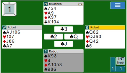 West plays the Jack of spades, won by the King. I have taken 4 tricks and have the AK of diamonds and the King of spades for the 3 additional tricks I need to make my contract.