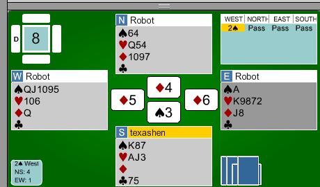 Out to see my mother in the Palm Springs area, I had a chance to play at the Duncan Bridge Center in Palm Desert, California. You may have heard of them, it is the 'Duncan' of the very popular Adobe Duncan online games. Duncan Bridge Studio meets in a fantastic facility which is owned by the club -- so lucky! On this particular day, they had 14 tables in the open game, and another 14 in a 0-750 game. My original partner was unable to play at the last moment, and I had the wonderful opportunity to play with Beverly Hartin; the club's learning center is named for her.