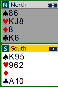 In the position above, instead of playing on hearts, play the club Ace, and a club to dummy's King. Now play the diamond 8 and resist the urge to trump. Instead, pitch your low heart. This puts East on lead at a time when he doesn't want to be on lead -- a classic endplay. If East leads a diamond or a club, he gives you a ruff and sluff, allowing you to pitch another heart from your hand while you ruff in dummy. You'll lose only one heart and one diamond. If East instead decides to lead a heart, he's leading into dummy's KJx, ensuring that you only have one heart loser (no matter who has the Ace, your King will win a heart trick) plus the diamond you used to endplay East.