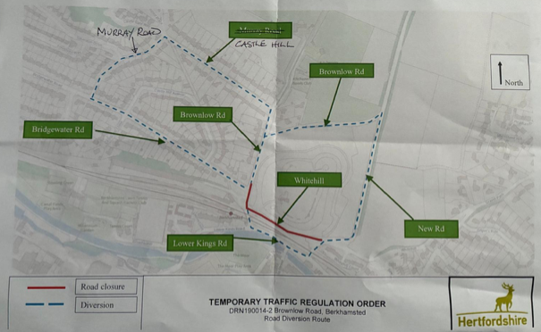 The road under the railway bridge will be closed 08:00 to 18:00 Monday to Friday. The only road with a 24/7 closure is where the commuters park (opposite the castle entrance) - red on the map. The blue markings on the map below are the diversion routes to use.