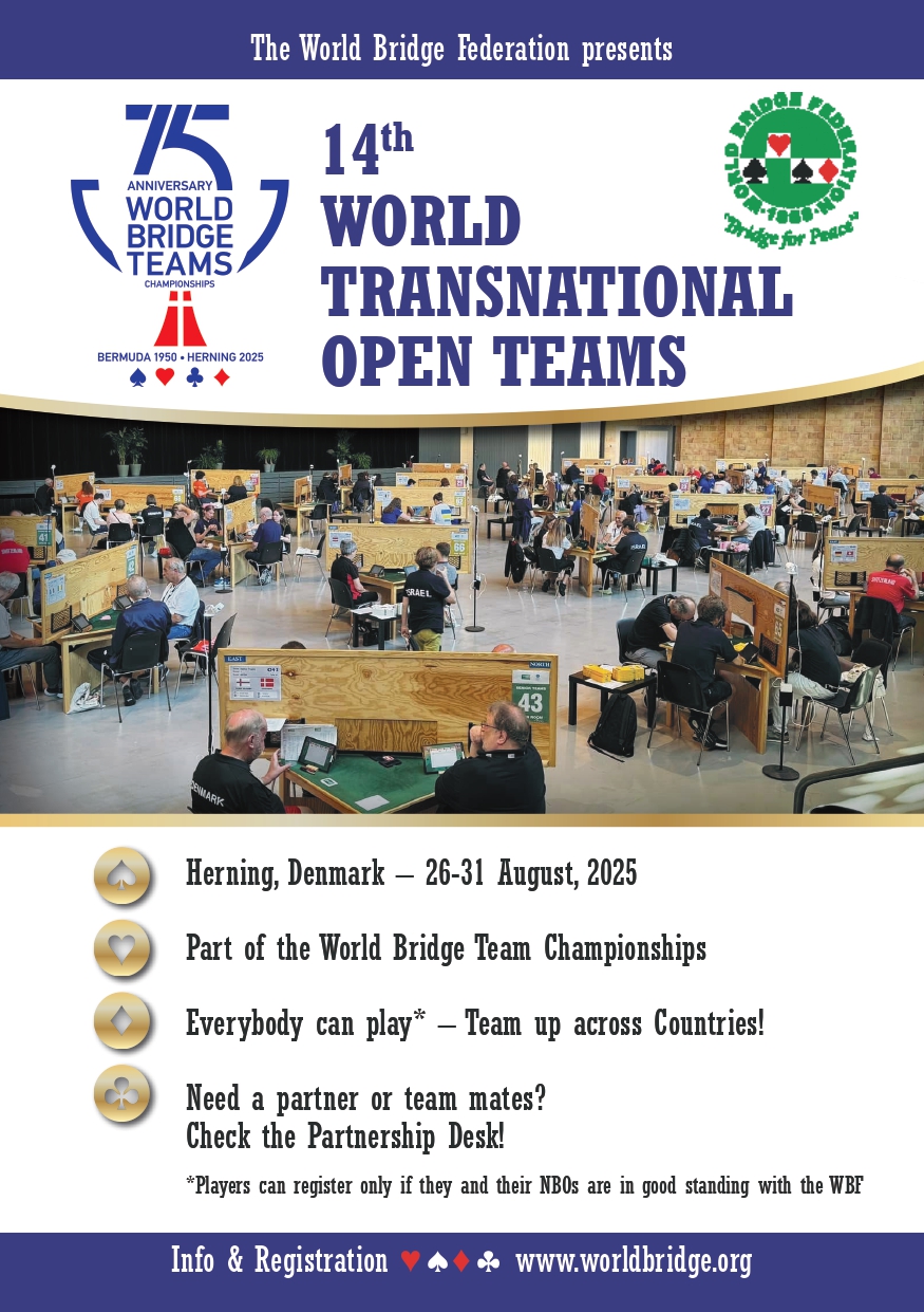 The World Transnational Open Teams Championship returns for its 14th edition – open to players of all nationalities, from all corners of the bridge world. Form your team, register and be part of one of the most exciting and inclusive international events in Bridge!
