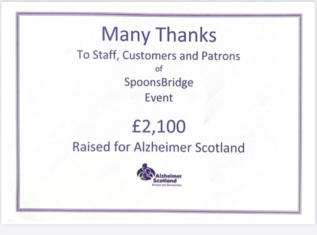 | A Thank you ‘certificate’ from Alzheimer Scotland for our 2023 fundraising |