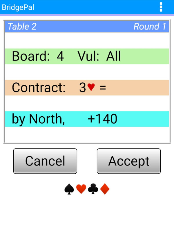 You need to show this screen to the opponents. If they are happy with what you entered, they will tap on Accept. If something needs correcting, they will tap on Cancel and this will take you back to contract entry screen.