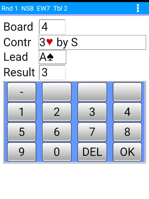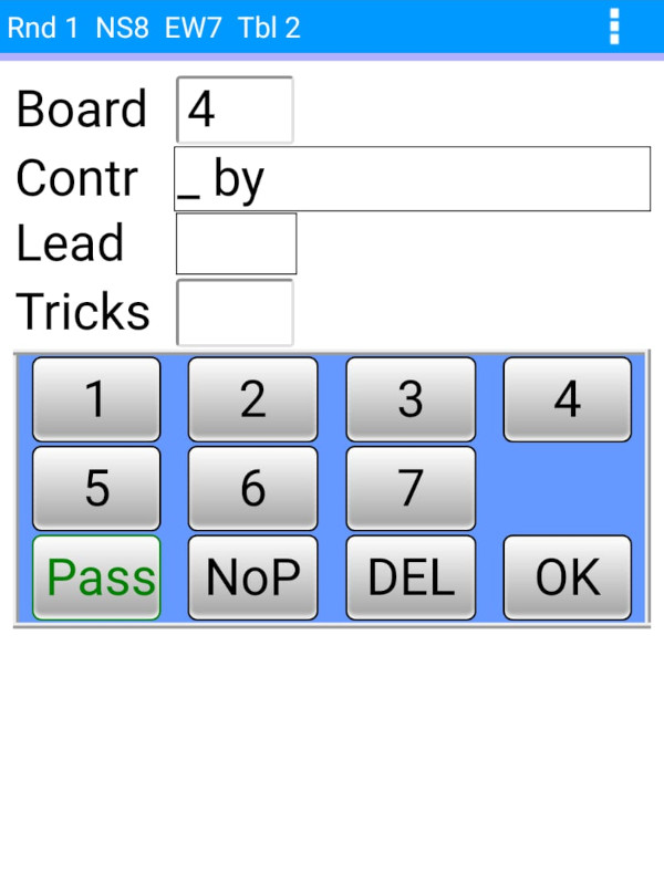 Enter contract screen has a dynamic keyboard which adapts to player input. This increases speed and accuracy of input. So for example it only requires 6-7 keystrokes / taps to enter the contract, lead and no of tricks. Screen is not cluttered with unnecessary information and the keys required at any one time are always at hand and easy to find. Also because of this screens easily fit on small mobile devices as well as larger tablets.
