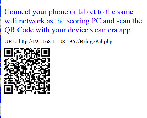This is used to run BridgePal app in the browser on any device, in particular iPhone and iPad. You need to connect the device to the scoring WiFi first and then scan the QR code above to start BridgePal app in the browser. On an android device you don't need to install the BridgePal app from the Google Playstore in this case.