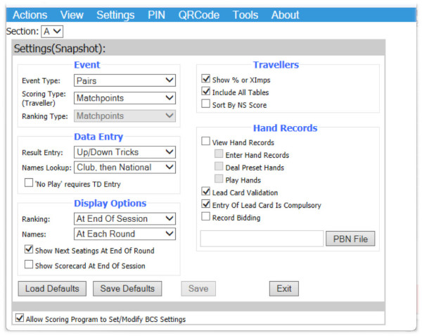 The current settings can be saved as defaults for future sessions. There is one set of defaults per event type (Pairs, Teams, Swiss Pairs, etc). When the 'Save Defaults' button is clicked the current settings will be saved as the defaults for the current event type. Similarly, if the 'Load Settings' button is clicked, the current settings will be replaced by the defaults for the current event type. If changes are required for the current session only, then after changing the settings on the screen click on the 'Save' button, rather than 'Save Defaults'.