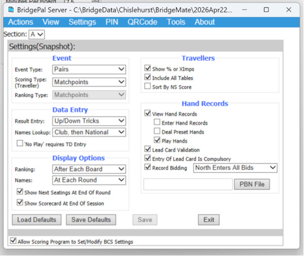 Users may find it simpler to make all settings changes in BridgePal server rather than in the scoring program. This can be achieved by clearing the checkbox 'Allow Scoring Program to Set/Modify BCS Settings' and clicking on 'Save'. This is a global setting and will take effect for subsequent sessions for all event types.
