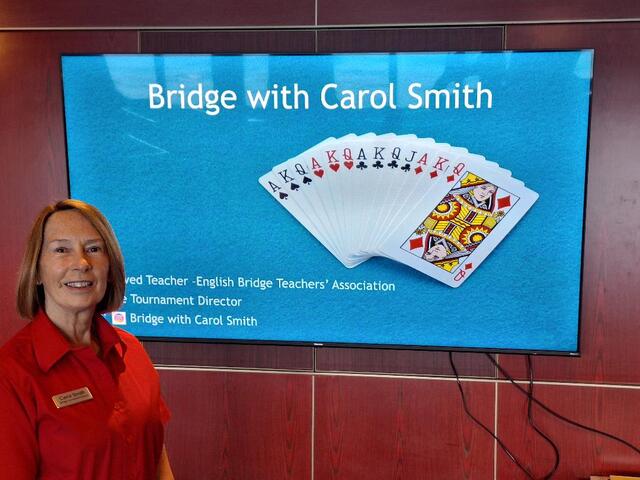 Carol enhances the bridge learning journey by offering Gentle Supervised Duplicate sessions, designed to ease the transition from classroom learning to playing in a club setting. She also hosts popular Bridge Experience Weekends, where learners can enjoy a relaxed mix of tuition and duplicate play in a sociable environment. In addition, Carol is a regular and popular, Bridge teacher on cruise ships.