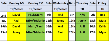 All morning sessions start at 10.00 am and all evening sessions at 7.00pm, unless stated otherwise. The afternoon session starts at 2.00 pm. Please arrive 15 minutes before the start of playing sessions to give the TD time to set up the computer for a prompt start.