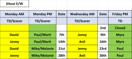 All morning sessions start at 10.00 am and all evening sessions at 7.00pm, unless stated otherwise. Please arrive 10 minutes before the start of playing sessions to give the TD time to set up the computer for a prompt start.