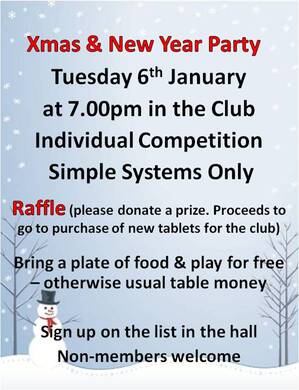 In order to avoid having to ask a Pair to drop out, can we ask that you let Martin Joseph know in advance if you intend to come. Please also ensure that you arrive by 6.50pm.