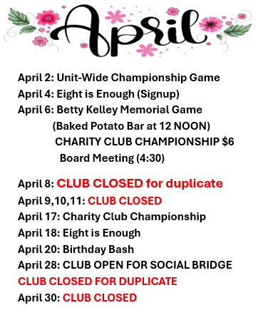 Tuesday, March 31: CLUB CLOSED