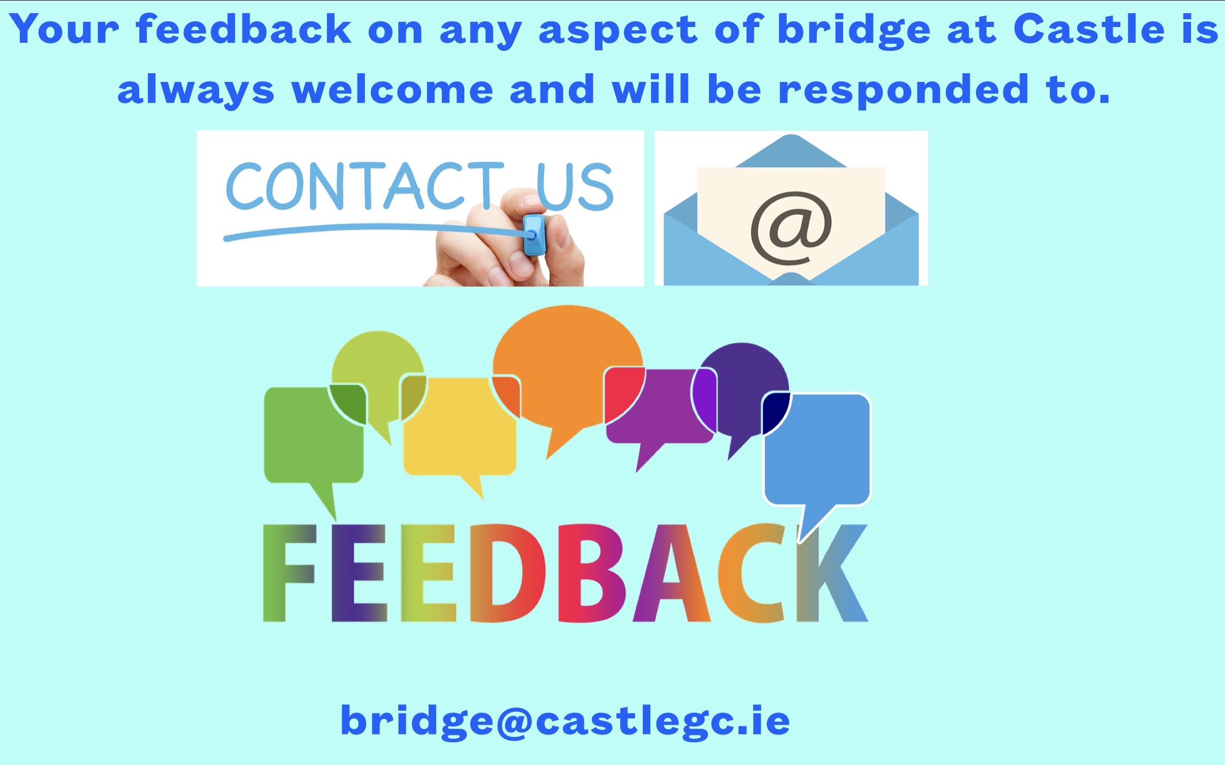 Bridge at Castle is played in the Clubhouse on Monday evenings from mid-September to mid-April. Play begins at 7:15pm. Players are requested to be seated by 7:05pm to facilitate the organisation of the game. All adult members of the Club are welcome to play. Spouses of adult members are also welcome.