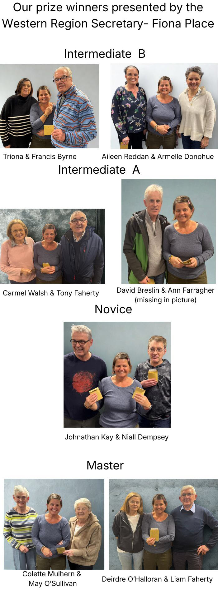 Congratulations to all our prize winners in the Regional Pairs competition, which took place in Galway Bridge Centre, Sat 6th Dec 2025 . See full results of the Inter B and Novice section here and Inter A and Master Section here.