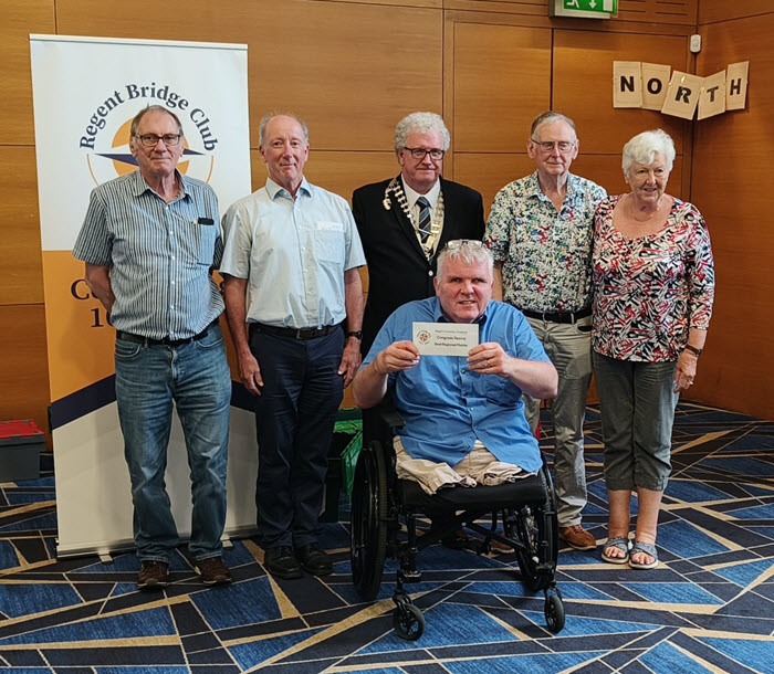 The Regent Bridge club celebrated its centenary year in UCD with a full lineup over the weekend 11-13th July 2025.Congratulations to our players from the Western Region, Patsy Donoghue and James Ward, along with their teammates Margaret Homes and Eugene Gath on coming first in the Regional Masters section T4 event.