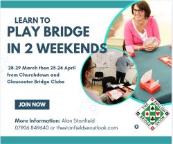 We are running our next Beginner lessons over 2 weekends (28-29th March and continuing on 25-26th April) in conjunction with Gloucester Bridge Club