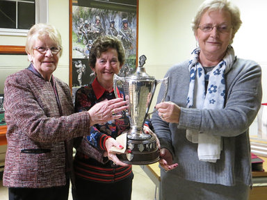 Club Secretary Eileen Lalor presents the Sorensen Cup to the 2015 Champions Bridie O'Donnell and Eileen Kelleher