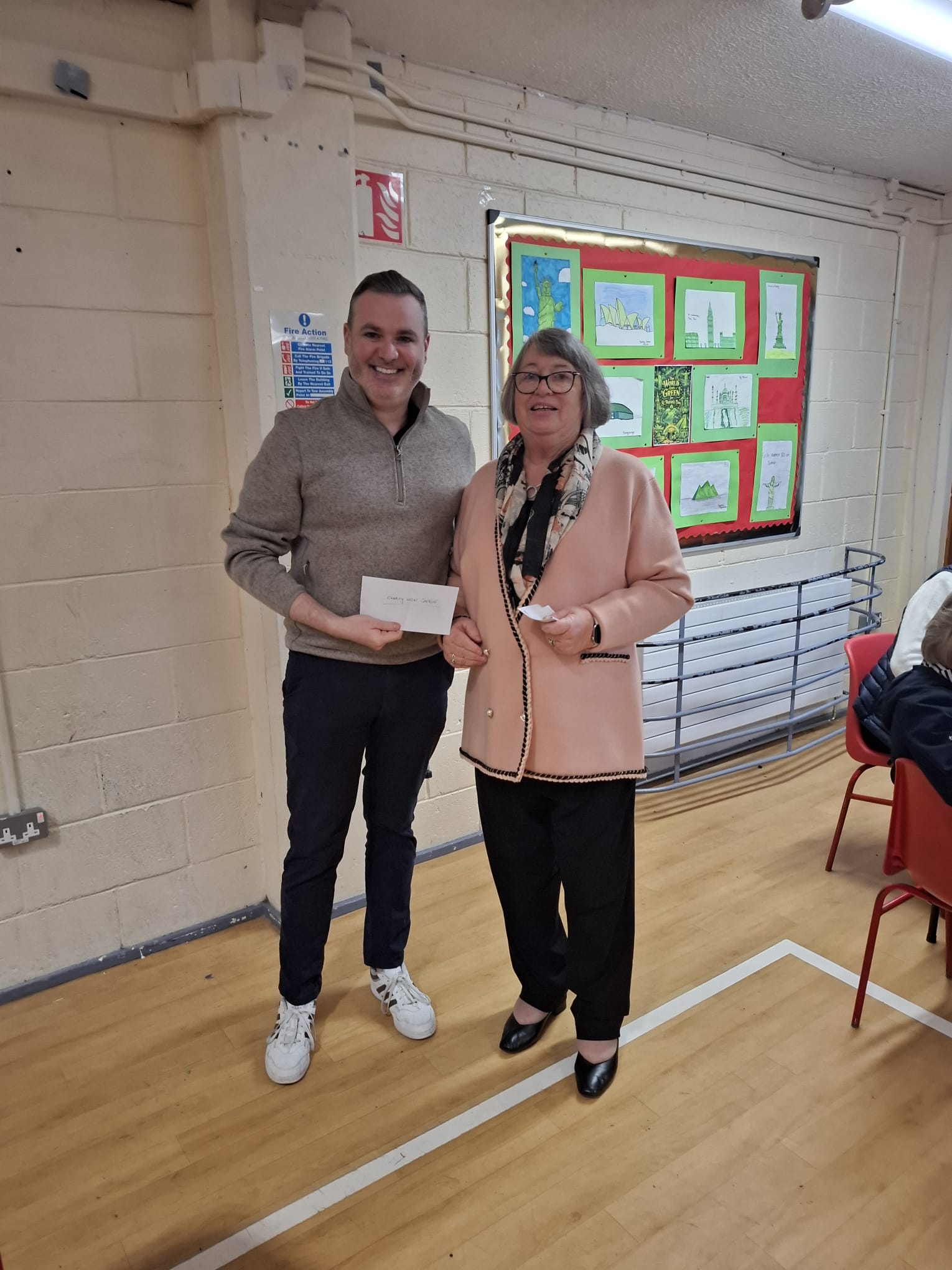 Club president Brigid Connolly presents a cheque for €1,500 to Mr Sean McKeown, Principal of St Francis Xavier's Senior National School.