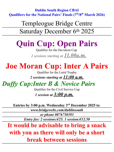 The following two flyers detail information about our next groups of competitions open to all affiliated bridge players of Dublin South Region.