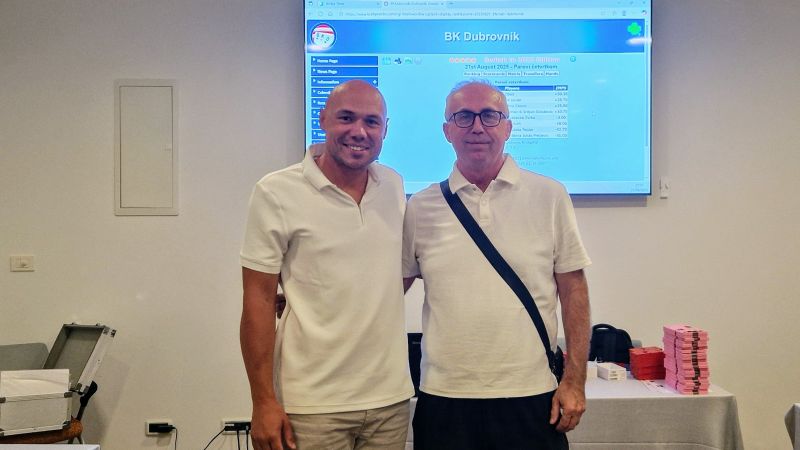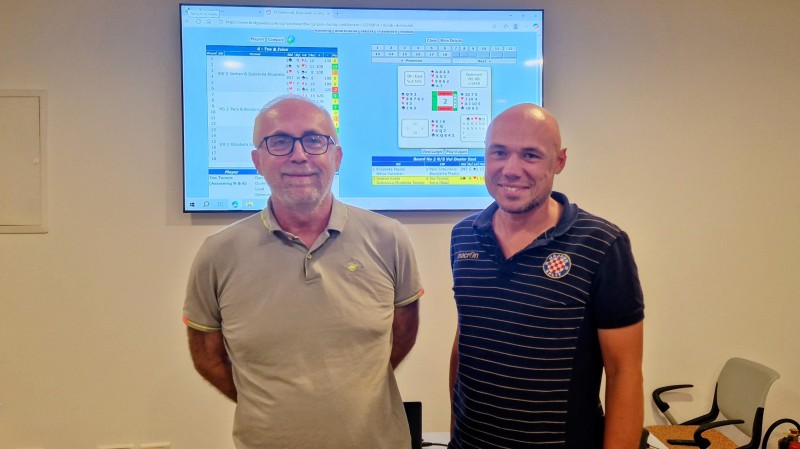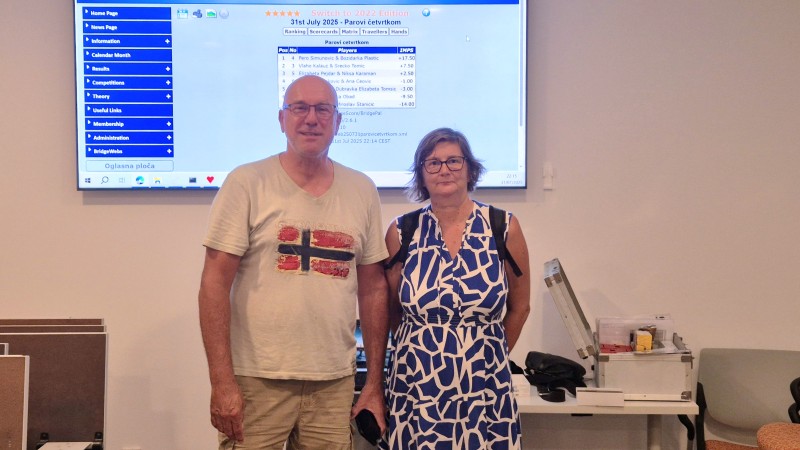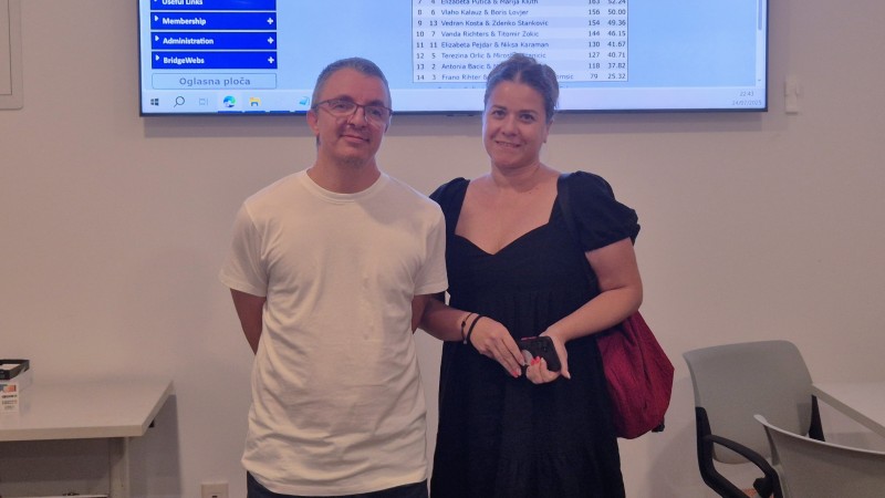 Treće mjesto zauzeli su Joško Đilović & Andrija Martić (16,3 IMPs), drugo mjesto osvojili su Dubravka Elizabeta Tomšić & Ivica Obad (20 IMPs), a pobjednici turnira su Đivo Tikvica & Antonia Bačić (30 IMPs). Čestitamo!