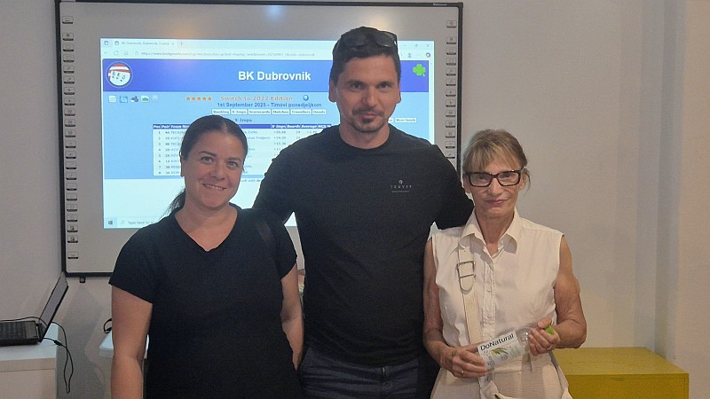 Đivo Tikvica & Antonia Bačić na trećem mjestu sa 11,8 IMPs; Elizabeta Pejdar & Nikša Karaman na drugom mjestu sa 12,3 IMPs, a prvo mjesto osvojili su Iva Strnad & Frano Mozara sa 16,5 IMPs. Čestitamo!