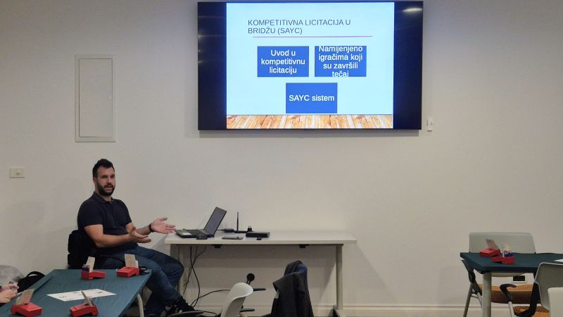 Na dva stola igrao se timski meč. Za trećim stolom su dvije najmlađe bridž nade, Lana (10) & Marin (14), igrale butler sa Srđanom, voditeljem bridž škole. To je pravi dokaz da je bridž igra zanimljiva svim generacijama!