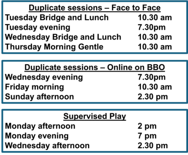 We continue to have a programme of Online Bridge via BBO and hold four weekly sessions of Face-to-Face bridge at the Club.