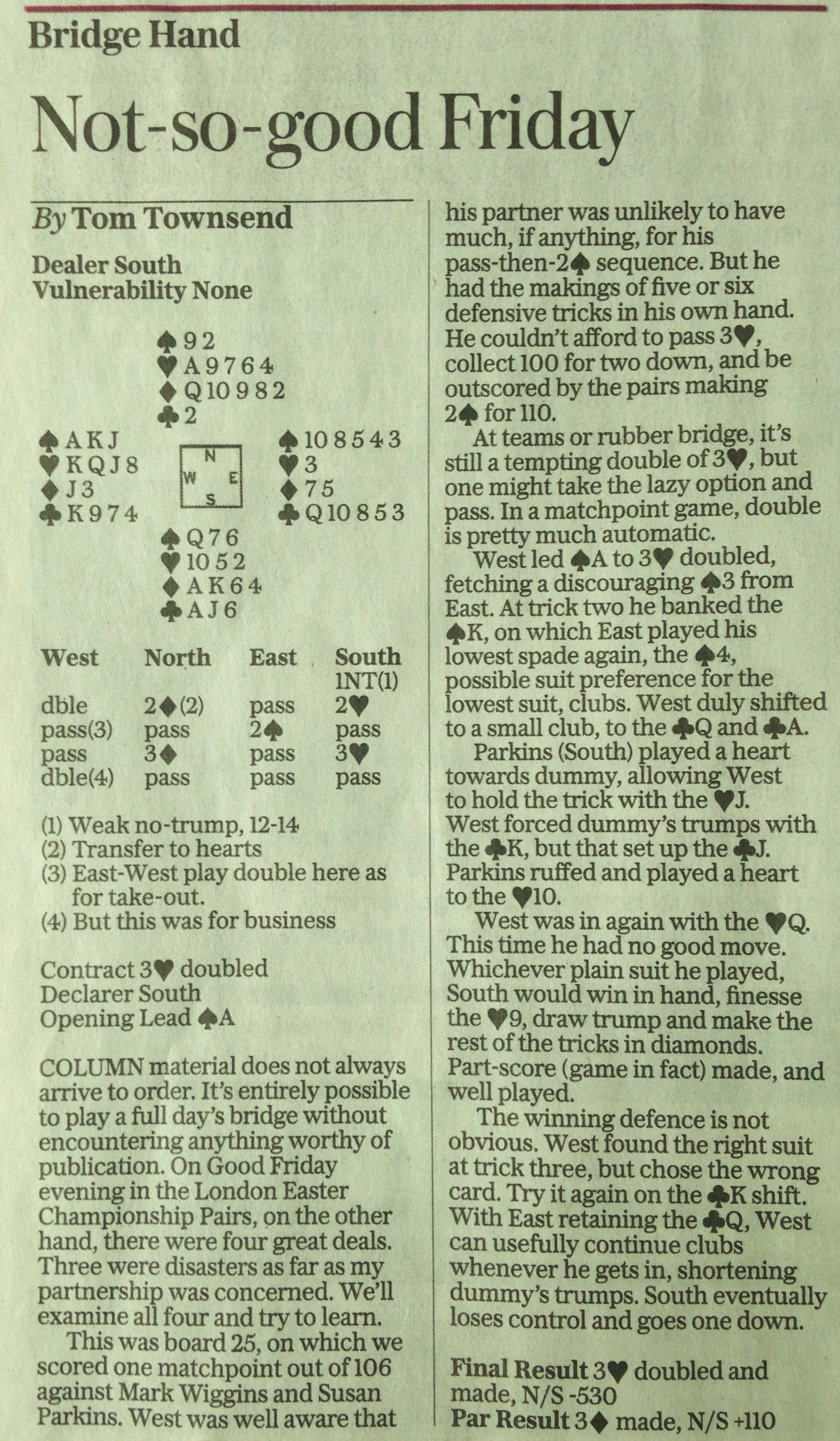 A hand reported in the Daily Telegraph (21st April 2017) from the EBU's Easter Congress.