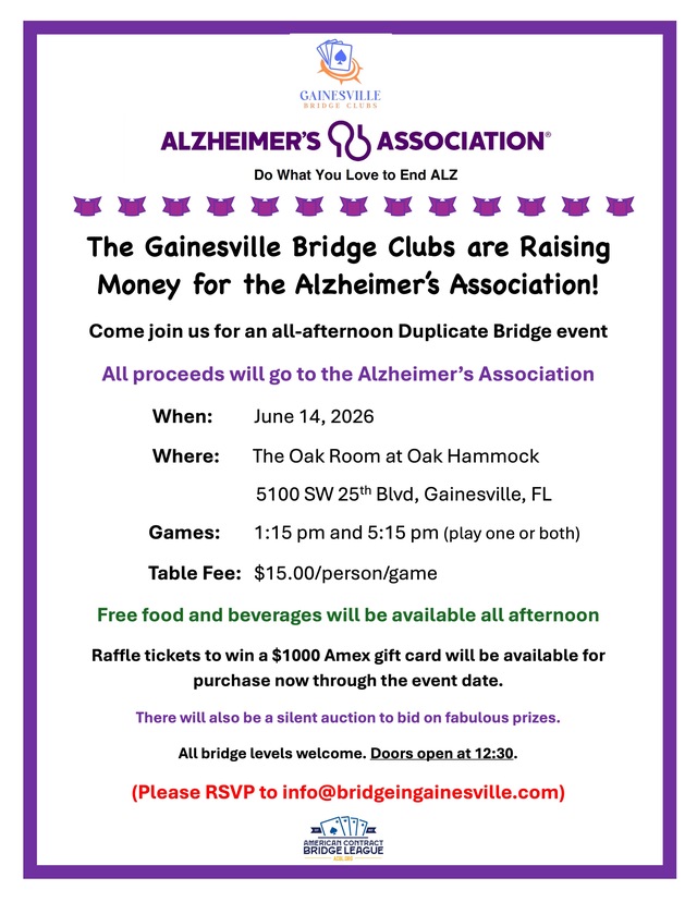 Registration Fee is $30 per person (this is in addition to the club or tournament table fees). 100% of this fee is donated to the ACBL Charity Foundation to support their work.