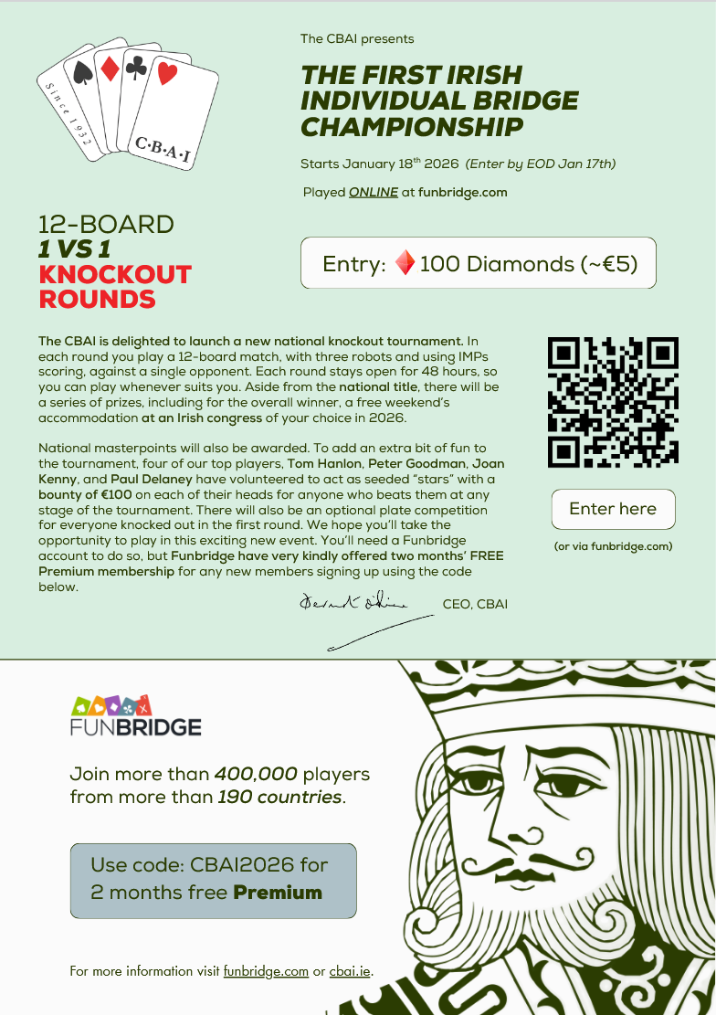 Please be advised of the first Irish Individual Bridge Championship. See flyer for details.