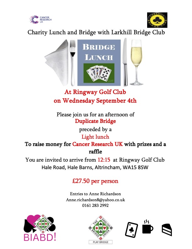 CONRATULATIONS to the following club members who have qualified for the EBU NATIONAL PAIRS REGIONAL FINALS: Judith Jury, David Harper, Adam Wiseberg, Joan Duckworth, Helen Hauser, Jackie Burns, Mary Maybank, Anne Richardson, Sue Bloor, Sue Wood, Ruth Levy, Edwina Abbott, Sally Duncombe, Su Gomez, Paul Rigby, Daphne Hough, Terry Dwyer and Anneke Broomby. You will be receiving a congratulatory email from the EBU and details of how to enter and I would encourage you to do so as it will be played on RealBridge with which you are all familiar. You can also find details of how to enter on the Manchester County Bridge Association website.