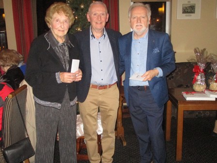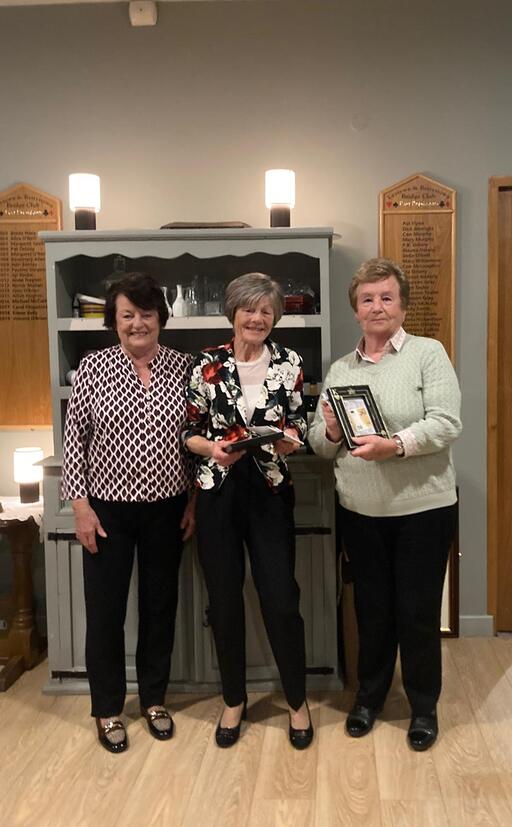 Our president Toni Leech presents the presidents prize to winners Mary McIlhenny and Adri Berney .