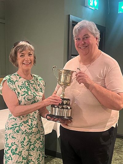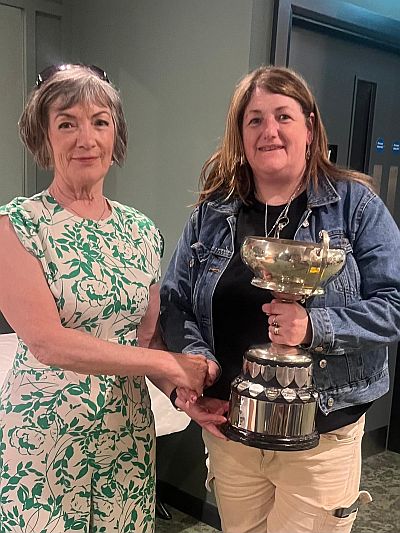 Edna and Judith McElhinney presented with the Intermediate B player of the year cup by Lady President Caro O'Connell on behalf of their mother Vera McElhinney R.I.P.. She will be sadly missed by all at Letterkenny Bridge Club.