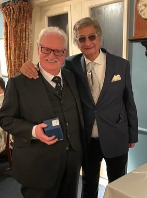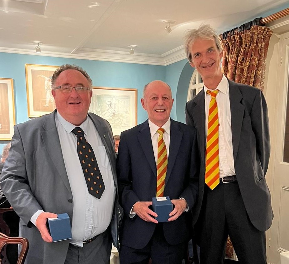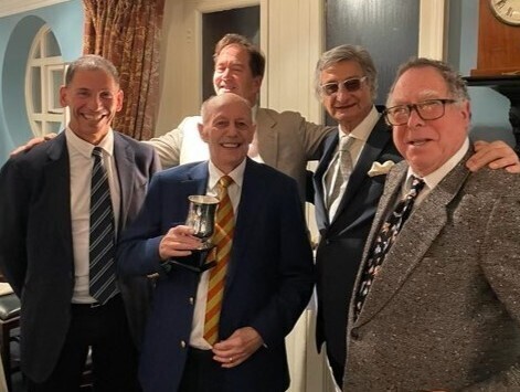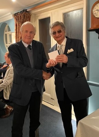 Presentations covered our events in 2020 and 2021. Maril Silverstone presented 2021 Rubber Bridge champions Barrie Gilbert and Steve Foster with the splendid Brian Silverstone Trophy, generously given to the Club by the family in Brian's memory. Richard Cumming-Bruce took home a hatful of prizes: winner of the 2020-21 Master Points Trophy, runner-up in the same event in 2019-20, and a member of the winning team in the 2021 Lord's Trophy.