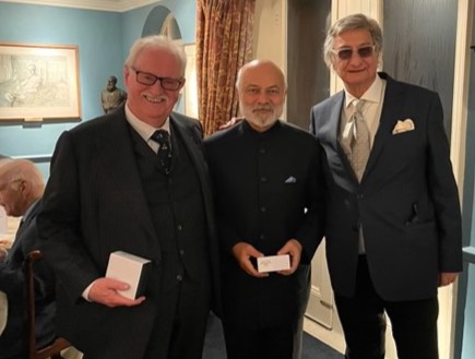 Guest of Honour Zia Mahmood presenting prizes at the 2025 Bridge Society Dinner: Rubber Bridge winners Beverly Black and Irene Fine (not present), and runners-up Trevor Southam and David Soanes (not present), winners of Rubber Bridge Plate Geoff Lane and Pralab Barua; Master Points winner Gary Diamond, runner-up Geoff Lane; Lord's Teams winners David Alterman, Bill Coles, Harvey Laurence and Richard Samuel.